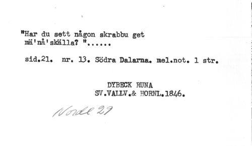 //// "Har du sett någon skrabbu get j //// nR'nå'shälla? "...... //// r //// sid.2l. nr. 13. Södra Dalarna, mel.not. 1 str. //// DYBECK RUNA //// SV.VALLV.& H0RNL.1846. ////
