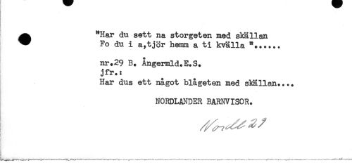 //// ^ "Har du sett na storgeten med skällan //// " Fo du i a,tjor hemm a ti kvälla **..... //// nr.29 B. Ångermld.E.S. //// jfr.: //// Har dus ett något blågeten med skällan.... //// NORDLANDER BARNVISOR. //// 3 //// i ////