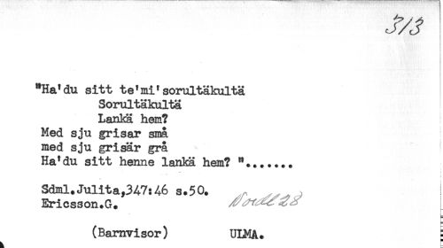 //// "Ha'du sitt te'mi'sorultäkultä //// Sorultäkulta //// LanKa hem? ! //// Med sju grisar små //// med sju grisar grå //// Ha'du sitt henne lanlsä hem? //// T . ' //// Sdml.Julita,347:46 s.50. ! //// Ericsson.G. //// (Barnvisor) UIMA. S //// ^ E ////