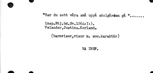 //// "Har du sett vara små uppå skolgården gå ..... //// insp* Rt j . bd. Sv. 1264:1:3. //// Veländer, Just ina.Korland^ //// (barnvisor,visor m. soc.karaktär) //// RA INSP. ////