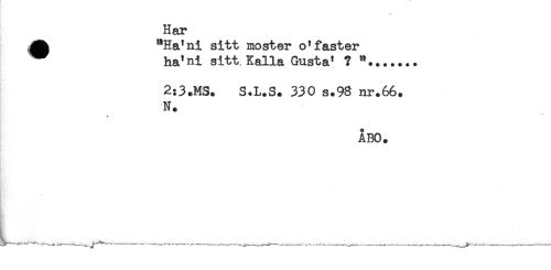 //// Har //// "Ha'ni sitt moster o'faster //// ^ ha'ni sitt, Kalla Gusta' ? "....... //// 2:3.MS. S.L.S. 330 s.98 nr.66. //// N. //// ÅBO. //// ----f-T-----------____---------- ////