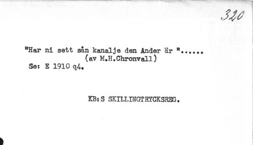 //// < //// ! //// ! //// ! //// i //// "Har ni sett san kanalje den Änder är //// (av M.H.Chronvall) //// Se: E 1910 q4. //// KB:S SKILLINGTHYCKSREG. ////