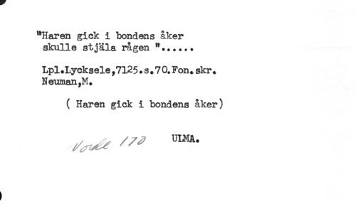 //// "Haren gick i bondens åker //// skulle stjäla rågen *.....* //// Lpl.Lycksele ,7125. s. 7 0. Fon* skr. //// Neuman,M. //// ( Haren gick i bondens åker) ////