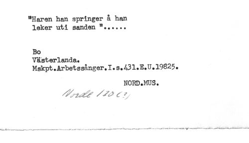 //// "Haren han springer å han //// leker uti sanden //// Bo //// Västerlanda. //// Mskpt.Arbetssånger.I.s.431.E.U.19825. //// NORD.MUS. ////
