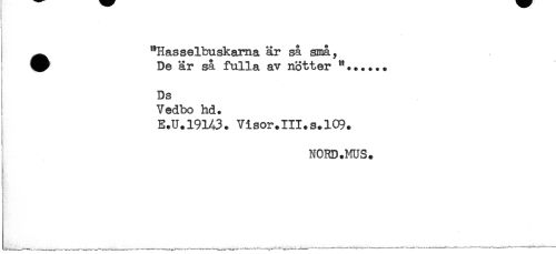 //// ^ "Hasselbuskama är så små, //// ^ De är så fulla av nötter "...... //// Ds //// Vedbo hd. //// E.U.19H3. Visor.III.s.109. //// NORD.MUS. ////