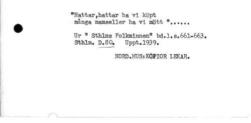 //// "Hattar,hattar ha vi köpt //// ^^ många mamseller ha vi mött *...... //// Ur " SthLns Folkminnen" bd.l.s.661-663. //// Sthlm. D.80. Uppt.1939. //// NORD.MUS:KOPIOR LEKAR. ////