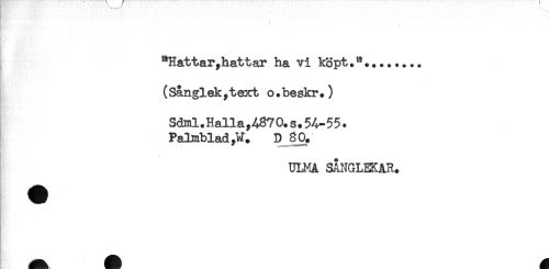 //// : ' , . / //// - //// "Hattar,hatt ar ha vi köpt //// (Sånglek,text o.beskr.) //// * //// Sdml.Halla,4870.s.54-55. //// Palmblad D 80. //// ULMA SANGLEKAR. //// - ////