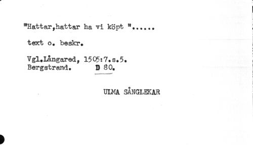//// "Hattar, hatt ar ha vi köpt *...... I //// i //// texrt o. beskr. //// ! //// Vgl.Langared, 1505:7. s. 5. i //// Bergstrand. B 80. //// *......-* //// i //// t //// ! //// ULMA SÅNGLEKAR ////