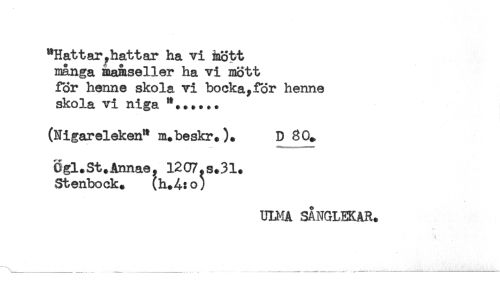 //// "Hattar, hatt ar ha vi mött //// många mamseller ha vi mött //// för henne skola vi bocka,för henne //// skola vi niga "...... //// (Nigareleken" m+beskr.). D //// Cgl.St.Annae, 1207.S.31. //// Stenbock. (h.A:o) //// ULMA SANGLEKAR. //// \ _____ -_______ _ ////