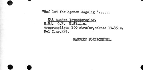 //// **Haf Gud för ögonen dagelig *...... //// . ... //// Ett hundra levnadsreglor. //// H.Bj. G.K. W.83.4.n. //// ursprungligen 100 strofer,saknas 19-35 s. //// Del 1.nr.229. //// RANCKEH FÖRTECKNING. ////