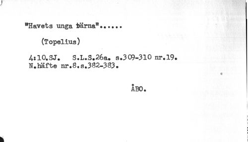 //// "Havets unga bäma".....* //// (Topelius) //// 4:10.SJ. S+L.S.26a. s.309-310 nr.l9. //// N.häfte nr.8.s.382-333. //// * //// ÅBO. //// I //// i //// { //// < ////