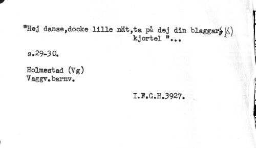 //// "Hej danse,docke lille nät,ta på dej din blaggar^M,) [ //// kjortel "... " ^ L //// s.29-30. //// HolmBstad (Vg) //// Vaggv.bamv. 1 //// I.P.G.H.3927+ j ////