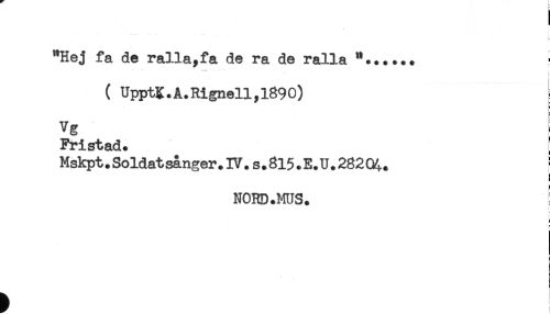 //// ! //// j //// "Hej fa de ralla,fa de ra de ralla "...... //// ( UpptX.A.Rignell,l890) //// Vg //// Fristad. //// Mskpt.Soldatsånger.IV.s.8l5.E.U.28204. ^ //// t //// t //// NORD.MUS. ' ////