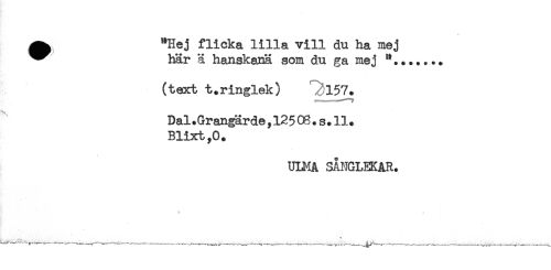 //// ^ "Hej flicka lilla vill du ha mej //// ^^ här ä hanskanä som du ga mej *....... //// (text t.ringlek) ^157. //// Dal.Grangärde,12506.s.11. //// Blixt,0. //// ULMA SÅNGLEKAR. ////