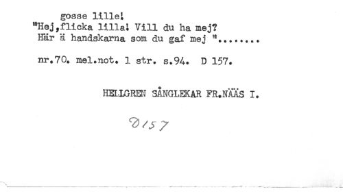 //// gosse lillet //// "Hejyflicka lillai Vill du ha mej? //// Här ä handskarna som du gaf mej **....*.. * //// nr.70. mel.not. 1 str. s.%. D 157. //// HELLGREN SÅNGLEKAR FR.NÄÄS I. ////