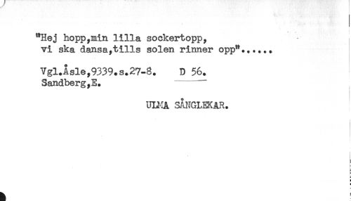 //// ..... ) *. //// "Hej hopp,min lilla sockertopp, //// vi ska dansa,tills solen rinner opp"...... //// Vgl.Åsle,9339.s.27-8. D 56. //// Sandberg,E. "-----, //// UU^IA SANGLEKAR. //// b //// - //// c //// i ////