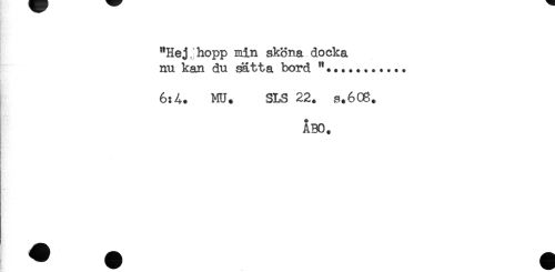 //// "Hej hopp min sköna docka //// nu kan du sätta bord "....+...... //// 6:4. HU. SLS 22. s.608. //// ÅBO. ////