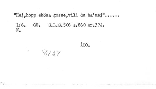 //// "Hej,hopp sköna gosse,vill du ha'mej"...... //// 1:6. GU. S.I..S.508 s.860 nr.374. //// N. //// ÅBO. //// ^ / < / ////