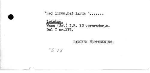 //// ^ "Hej lirum,hej larum "....... //// Leksång. //// Wasa (Jst) I.R. 10 versrader //// Del I nr.237. //// RANCKEN FÖRTECKNING: //// '/F //// ) //// _____ _______ _____ ////