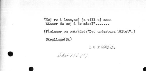 //// "Hej ro i lann,nej ja vill ej mann //// känner du mej å de mina?"....... //// -F * //// (Påminner om omkvädet:"Det underbara baltet".) //// Skeglinge(Sk) //// L U F 2283:3. ////