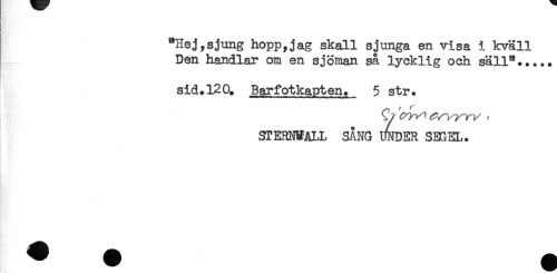 //// "Hej,sjung hopp,jag skall sjunga en visa i kväll //// Den handlar om en sjöman så lycklig och säll"..... //// sid.120. Barfotkapten. 5 str. //// Sy? ^^^-rv ^ //// STERNHALL SÅNG WDER SEGEL. ////