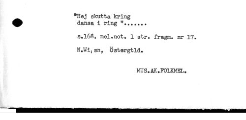 //// "Hej skutta kring //// ^^ dansa i ring //// s.168. mel.not. 1 str* fragm. nr 17. //// N.Wi, sn, Ostergtld. //// MUS.ÅK.FOLKMEL. ////