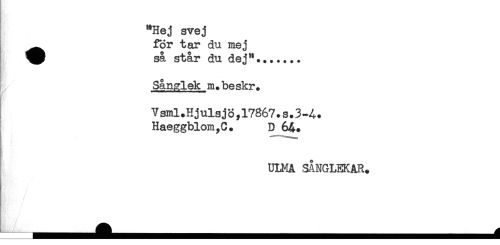 //// "Hej svej //// ^^ för tar du mej //// så står du dej"....... //// Sånglek m.beskr. //// Vsml.Hjulsjö,17867.s.3-4. //// Haeggblom,C. D 64. //// ULMA SÅNGLEKAR. ////