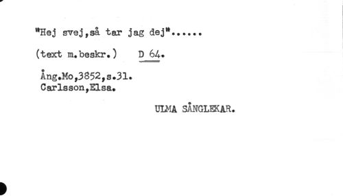 //// "Hej svej,så tar jag dej"...... //// (text m.beskr.) D 64* //// Ång.Mo,3852yS.31. //// Carlsson,Elsa. //// ULMA SANGLEKAR. ////