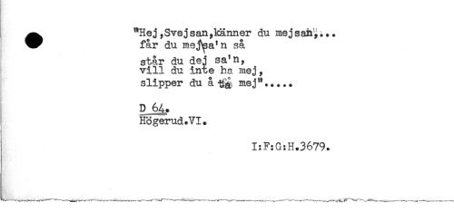 //// ^^ *Hej,Svejsan,käimer du mej san,... //// ^^ får du mej^a'n så //// står du dej sa'n, //// vill du inte ha mej, //// slipper du å ^ mej"..... //// Hogerud.VI. //// I:F:G:H.3679. ////