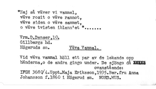 //// "Hej så väver vi vammel, //// väve rosit o väve rannot, //// väve siden o väve sammet, //// o väve tvisten iblann*et //// Vrm.D. Danser, 10. //// Gillbergs hd. //// Högeruds sn. Väva Vammal. //// Vid väva vammal höll ett par av de lekande opp //// händerna,o de andra gingo under. De sjöngo då EEBHB //// ovanstående: //// IFGH 368(/4.Uppt.Maja Eriksson,1935.Ber.fru Anna //// Johansson f+1860 i Högerud sn. NORD.MUS. //// \.......-........^ ////