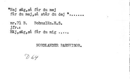 //// "Hej säg,så får du mej //// får du mej,så står du dej *....... ; //// nr.71 B. Bohuslän.E.S. ^ //// jfr.: ^ ^ i //// Häj,säg,så får du mig ..... ; //// i //// ! //// NORDLANDER BARNVISOR. i //// i //// i ////