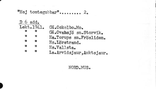 //// ! //// i //// ,D 6 add. //// Lekt.1941. Gä.Ockelbo.Mo. //// " " Gä.OvahsjS sn.Storvik. //// " " Ha.Torups sn.Frösliden. ! //// " " Hs.Lörstraiid. //// " " Hs.Vall sta. //// " " La.Arvidsjaur,Åuktsjaur. ! //// i //// NORD.MUS. ////
