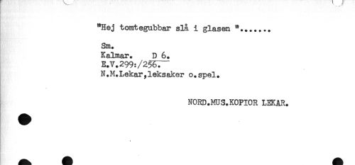 //// "Hej tomtegubbar sia i glasen *....... //// Sm. //// Kalmar. D 6. //// N.M.Lekar, leksaker o. spel. //// NORD.MUS.KOPIOR LEKAR. //// * ////