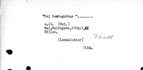 //// ^Mr' ^ ."' f.'''' i'' ' ' ' //// "Hej tomtegubbar "........ //// 3.22. (Mel.) //// Dal,Malingsbo ,20(R:3 //// Hällen. //// (Lekmelodier) //// ^ ULMA. ////