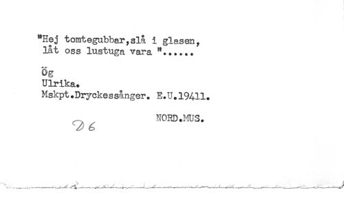 //// "Hej tomtegubbar,slå i glasen, //// låt oss lustuga vara //// ag //// Ulrika. //// Mskpt.Dryckessånger. E.U.19411. //// NORD.MUS. ////