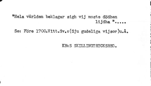 //// i- //// t //// i //// "Hela världen beklagar sigh vij moste dödhen f //// lijdha //// H //// B //// Se: Före 1700.Vitt.Sv.:(Sju gudeliga vijsor)u.å. [ //// i //// KF:S SKILUNGTRYCKSRBG. j //// < //// < //// i- //// - ////