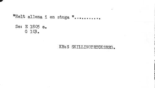 //// t //// "Helt allena i en stuga ...... //// Se: E 1805 e. ! //// G 103. //// : //// . //// i //// KB:S SKILLINGTRYCKSREG. ! //// ! //// i //// s //// i //// t ////