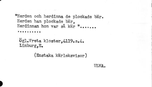 //// t //// < //// "Herden och herdinna de plockade bar. //// Herden han plockade bär, //// Herdinnan hon var sa kär *'....... //// t //// t //// r //// ! //// Ogl.Vreta kloster,4119.s.4. //// Linburg,E. //// ! //// (Enstaka kärleksvisor) //// UIMA. //// i //// i ////