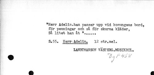 //// "Herr Adelin.han passar upp vid konungens bord^ //// för penningar och så för skurna kläder, //// Så litet han åt "*..... //// S.55. Herr Adelin. 12 str.mel. //// LANDTMANSOH VÄSTERG.MUSIKBIL. ////