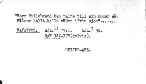 //// "Herr Hillebrand han talte till sin moder så: //// Blåser kallt,kallt väder ifrån sjön"....... //// Hafsfrun. Afz.^ 77:1. Afz.I 92. //// DgF 380-378(delvis). //// i //// GEIJER-AFZ. //// ' i ////