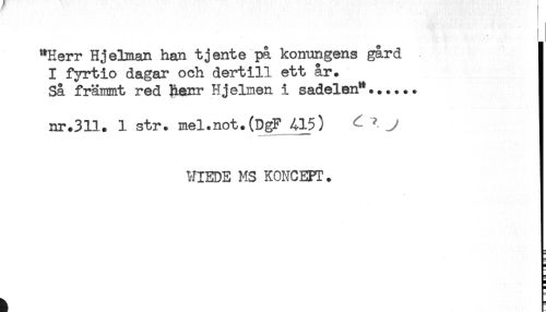 //// "Herr Hjelman han tjente på konungens gård j //// I fyrtio dagar och dertill ett år. j //// Så främmt red herr Hjelmen i sadelen".......j //// nr.311. 1 str. mel.not.(DgF 415) ^ ! //// WIEDE MS KONCEPT. //// h E ////