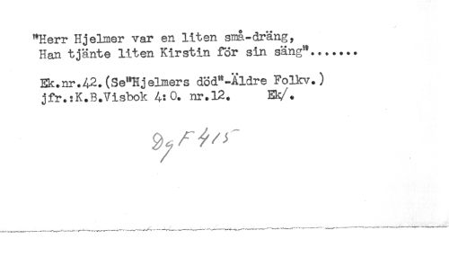 //// "Herr Hjelmer var en liten sina.-dräng, //// Han tjänte liten Kirstin för sin säng"....... //// Ek.nr.42.(Se"Hjelmers död*-Åldre Folkv.) //// jfr.:K.B.VisbokA:0. nr.12. ElV. //// 9 ' ////