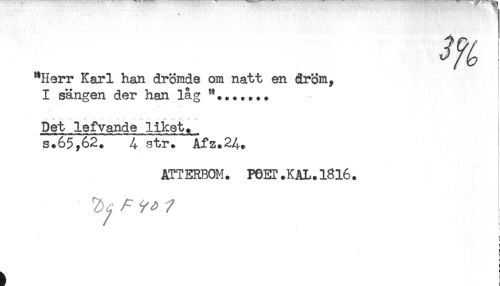//// "Herr Karl han drömde om natt en dröm, //// I sängen der han låg //// t //// Det lef vande liket. //// s.65,62. 4 str. Afz*24. //// ATTERBOM. POET.KAL.1816. //// É //// f //// c //// - //// ! ////