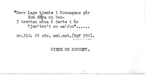 //// ! //// < //// ! //// "Herr Lage tjente i Konungens går //// Som dä^a nu bon- //// I trettan mana å derte i år //// Tjen'tro't nu sa'Jon"...... //// nr.310. 25 str. mel.not.(DgF 390). //// WIEDE MS KONCEPT. ////