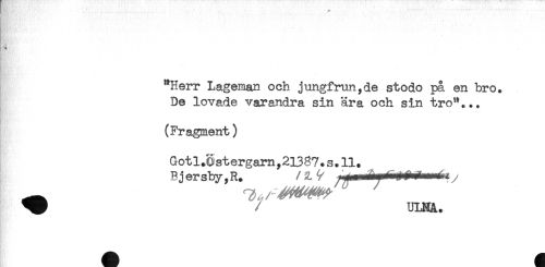 //// - //// ..... " ' //// "Herr Lageman och jungfrun,de stodo pa en bro. //// De lovade varandra sin ära och sin tro"... //// (Fragment) //// Gotl.Sstergarn ,23387. s. 11. //// B jersby,R. / 2. ^ i A* é^i ' ......n^jy //// ^ ULNA. ////