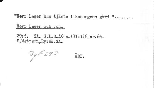//// "Herr Lager han tjänte i konungens gård "........ //// Herr Lager och Jon. //// 29:5. SA. S.L.S.40 s.131-136 nr.66. //// E.Matt son,Rys so.SA. ! //// i //// ^ ^^^ ÅBO. //// : //// i ////