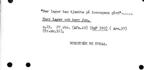 //// "Her lager han tjentte på konungens gård"...... //// Herr Lager och herr Jon. //// s.23. 27 str. (Afz.40) (DgF 390) ( årv.37) //// (Tr.nr.12). //// BORGSTBOM MS KVHAA. ////