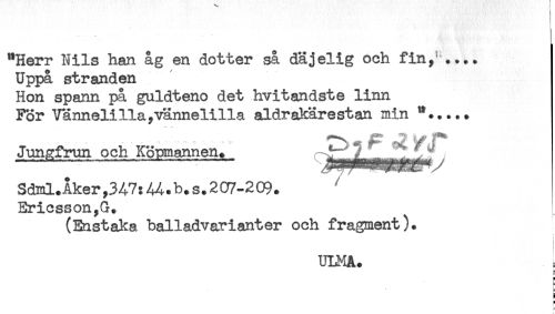 //// "Herr Nils han åg en dotter sa däjelig och fin, .... //// Uppå stranden //// Hon spann på guldteno det hvitandste linn //// För Vännelilla,vännelilla aldrakärestan min //// Jungfrun och Köpmannen._ ^^^^^ //// Sdml.Åker,3A7:44.b.s.207-209. //// Ericsson,G. //// (Enstaka balladvarianter och fragment). //// ULMA. //// H //// i //// H ////