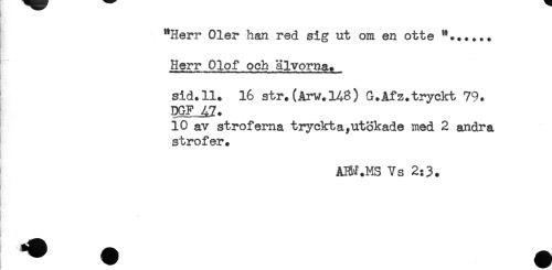 //// "Herr Oler han red sig ut om en otte "...... //// . //// Herr Olof och älvorna. //// sid.11. 16 str.(Arv.148) G.Afz.tryckt 79. //// DGF 42. //// 10 av stroferna tryckt a,utökade med 2 andra //// strofer. //// AHH.MS Vs 2:3. ////