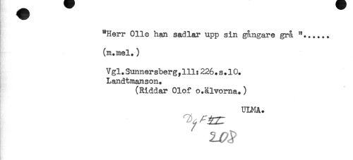 //// "Herr Olle han sadlar upp sin gångare grå //// (m.mel.) //// Vgl.Sunnersberg^lll:226.s.10. //// Landtmanson. //// (Riddar Olof o.älvorna.) //// ULMA. ////